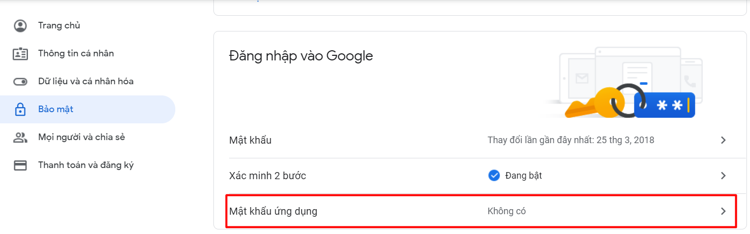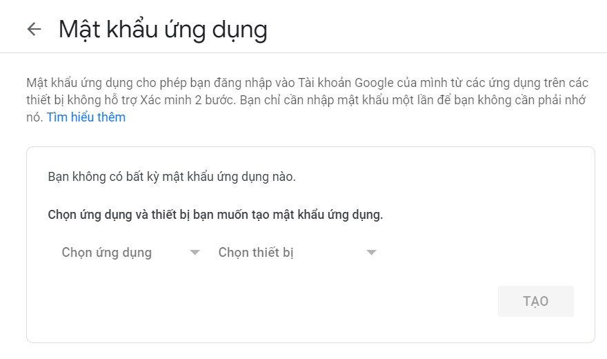 Khi các bạn chọn vào Mật khẩu ứng dụng sẽ hiện ra giao diện như sau: