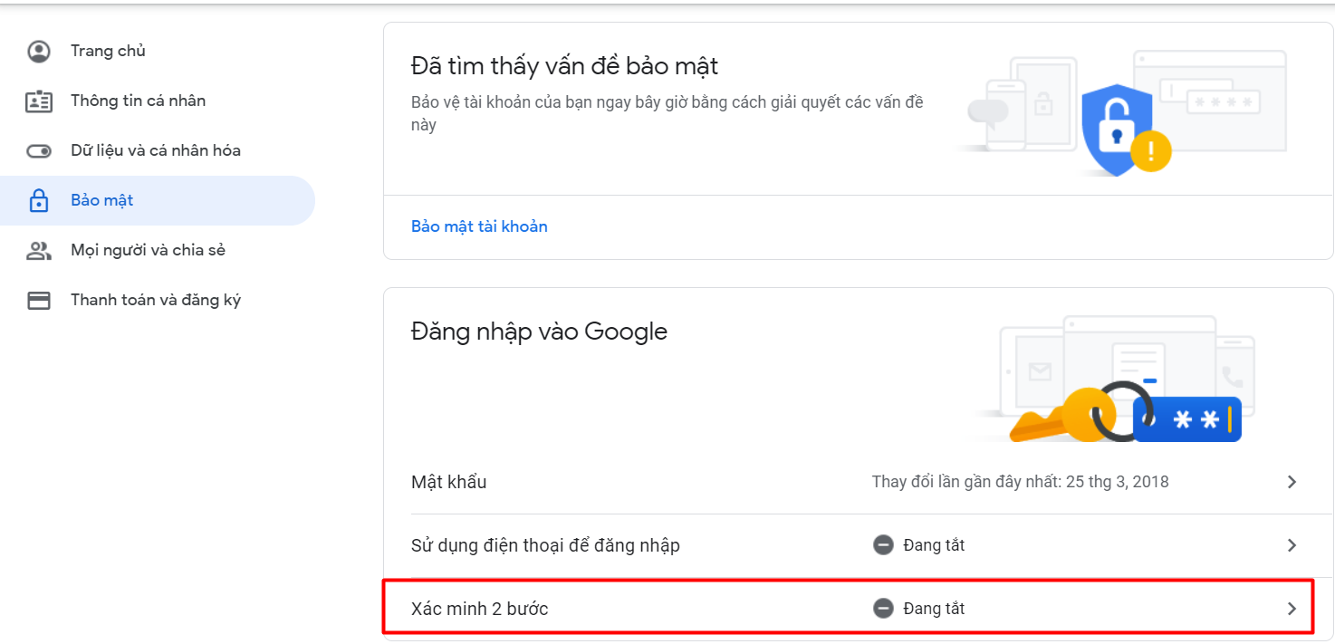 Sau khi bật Xác minh 2 bước lúc này tại trang Bảo mật của bạn hiển thị như sau: